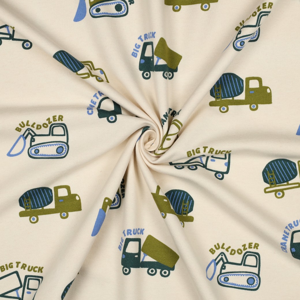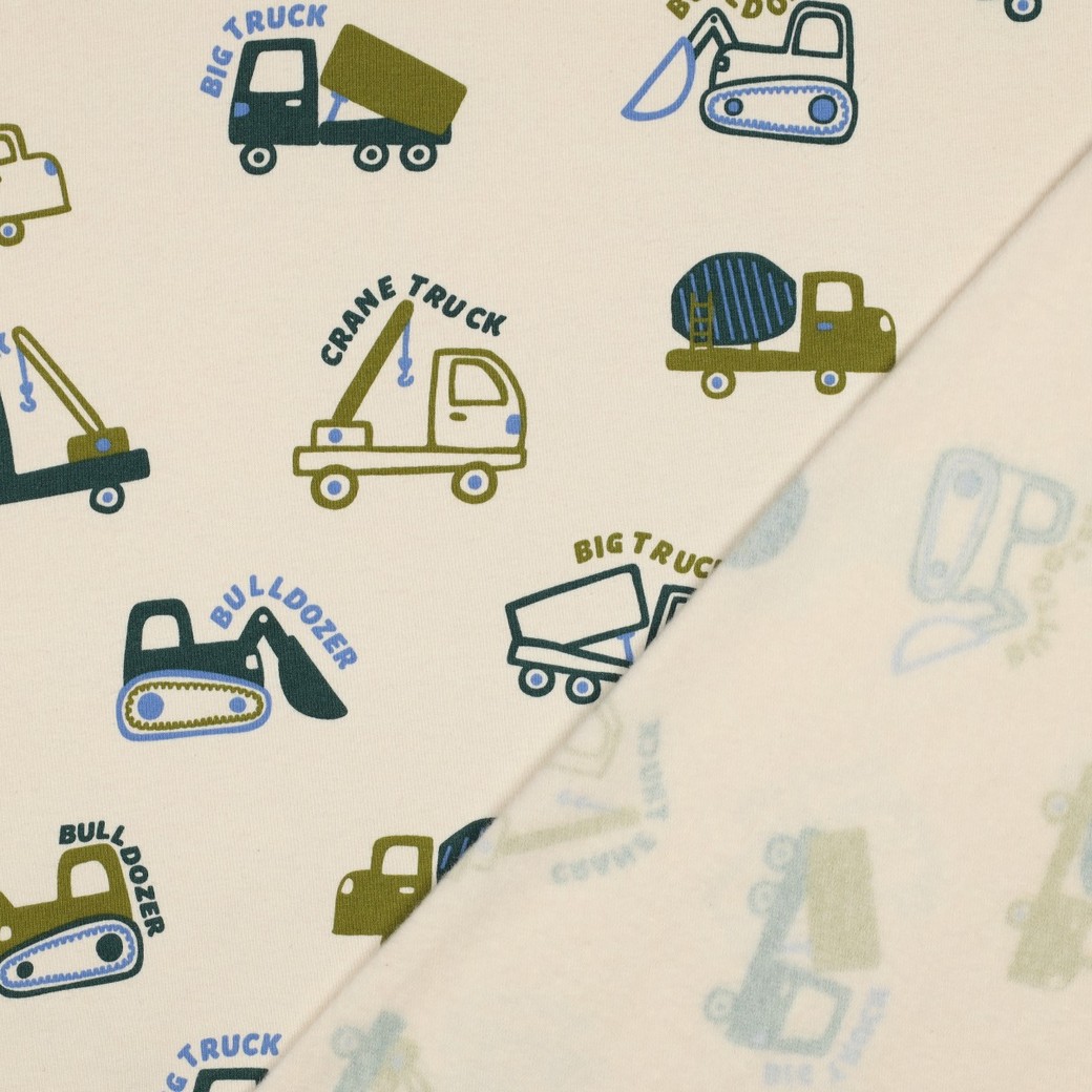 Ce coton ouaté doux met en vedette un motif de véhicules de chantier dans une palette calme et naturelle alliant vert olive, bleu tendre et ocre, sur un fond écru chaleureux.