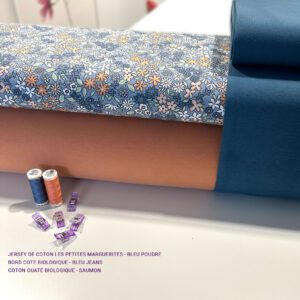 Couleur de biais jersey recommandée : Bleu poudre – Vert mousse – Blanc – Cognac