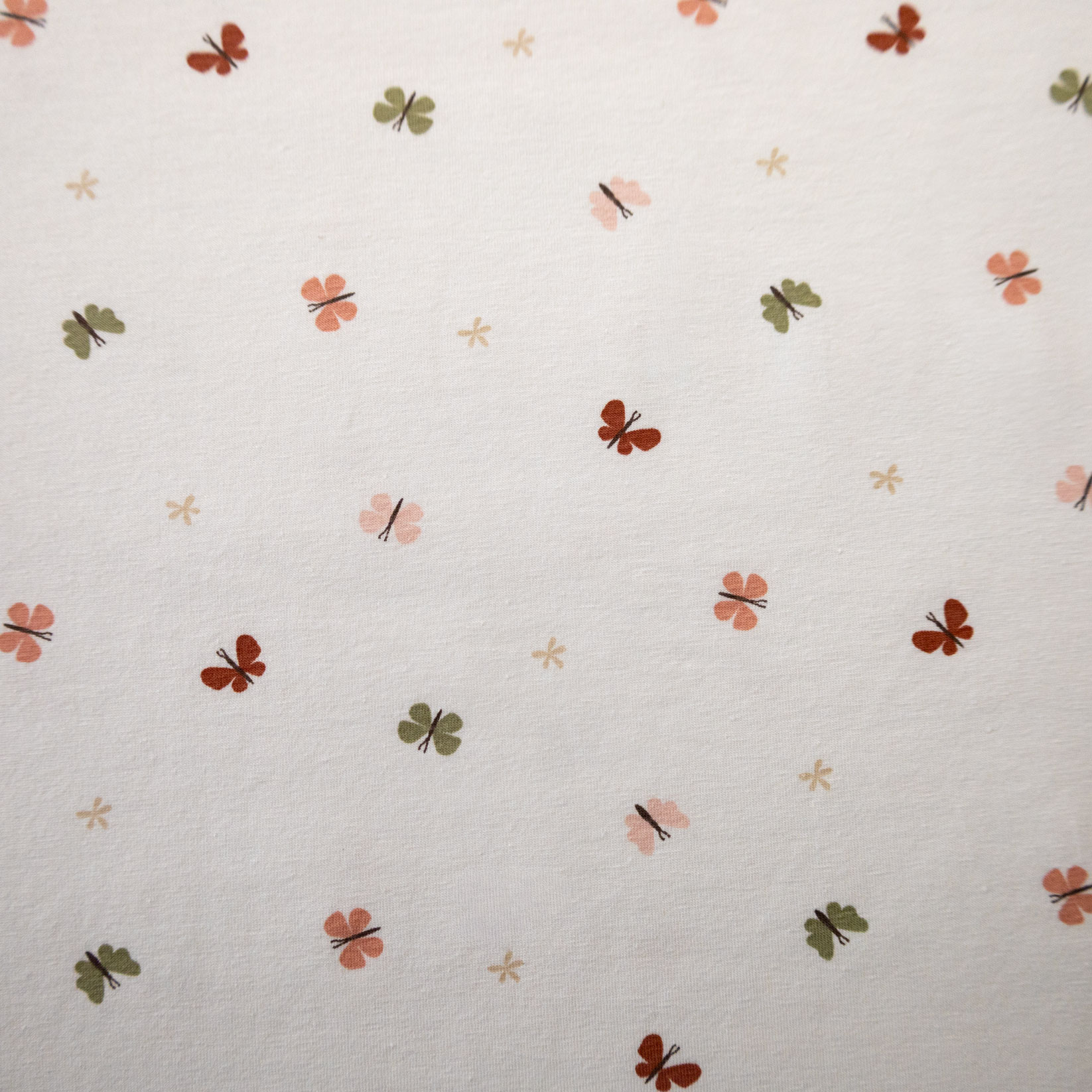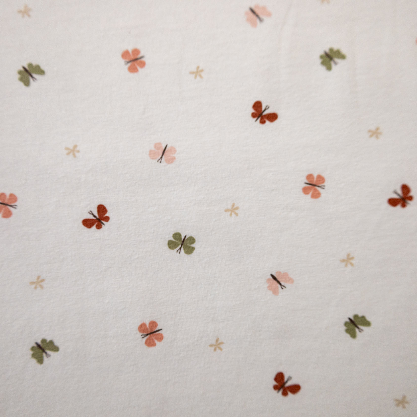 De gracieux papillons dansent entre ciel et feuillage, dans une palette feutrée de sauge, de terracotta et de rose doux.