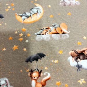 Un univers féérique où lapins et renards s’endorment sur des nuages ou s’envolent parmi les étoiles. Dans des tons chauds et réconfortants, ce jersey est idéal pour la couture de pyjamas, gigoteuses, vêtements douillets ou accessoires de chambre d’enfant.