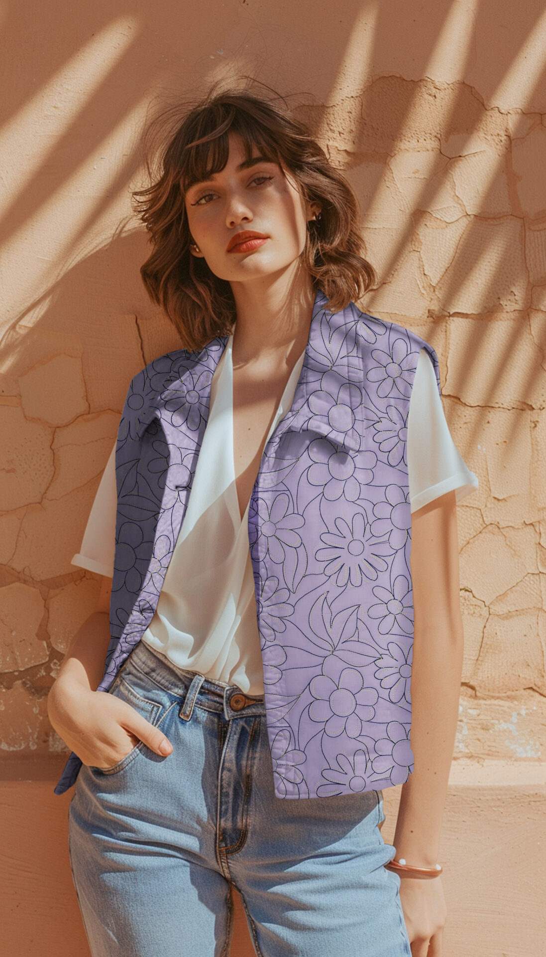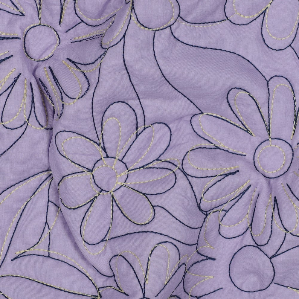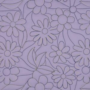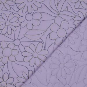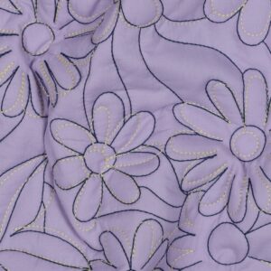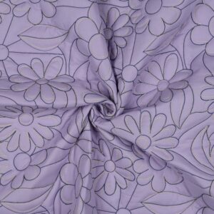 Un tissu matelassé au style poétique, orné de fleurs généreuses brodées en surpiqûres contrastées. Son coloris lavande tendre et lumineux en fait une base parfaite pour des créations originales et raffinées.