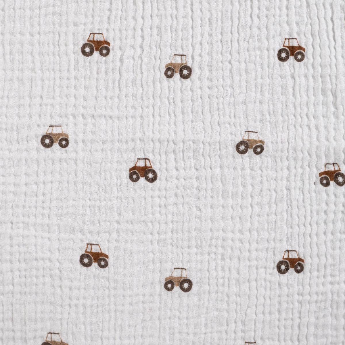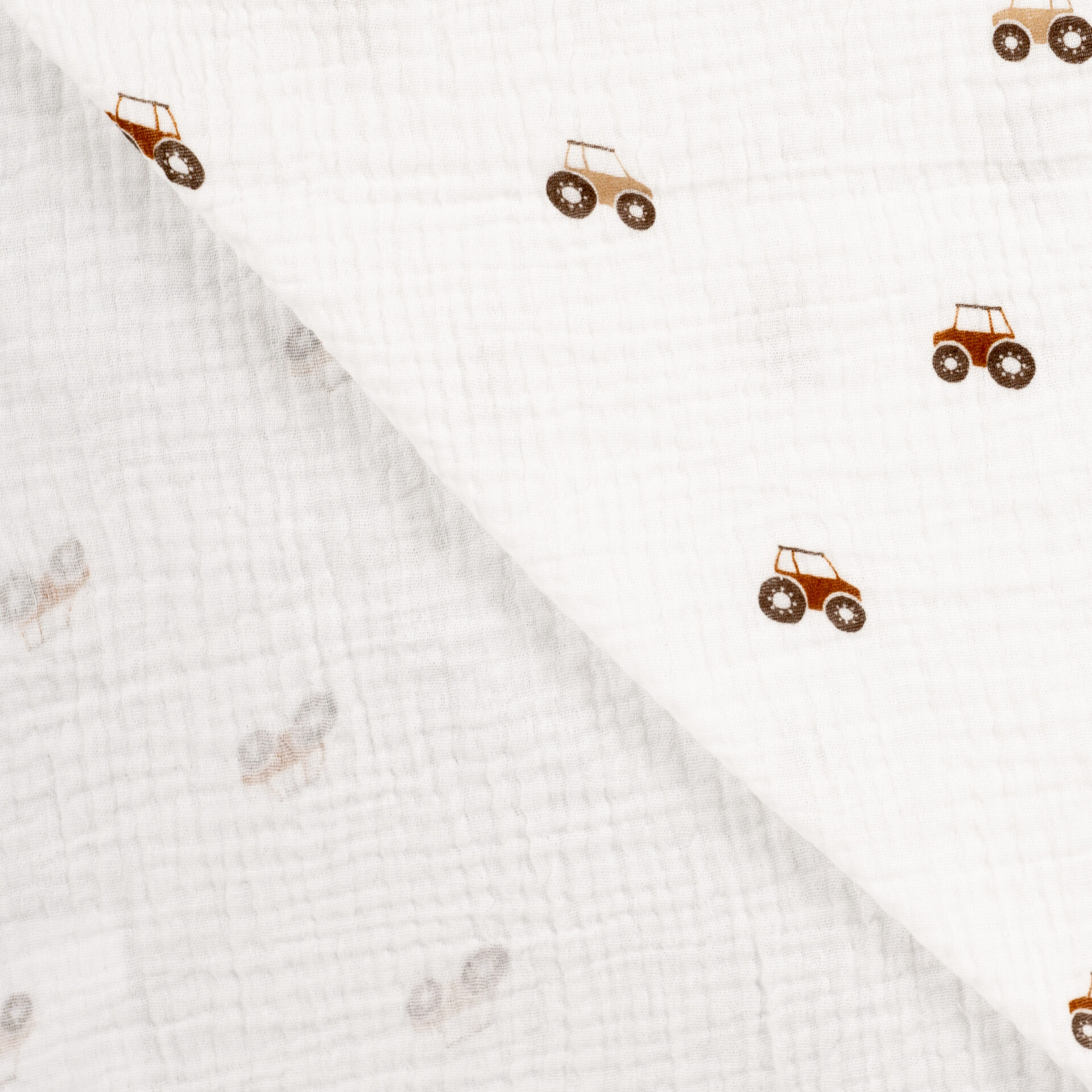 Cette mousseline de coton au charme rustique présente un fond écru délicatement texturé, décoré de petits tracteurs dans des nuances naturelles de brun et de beige. Un motif simple et chaleureux qui évoque la douceur de la campagne.