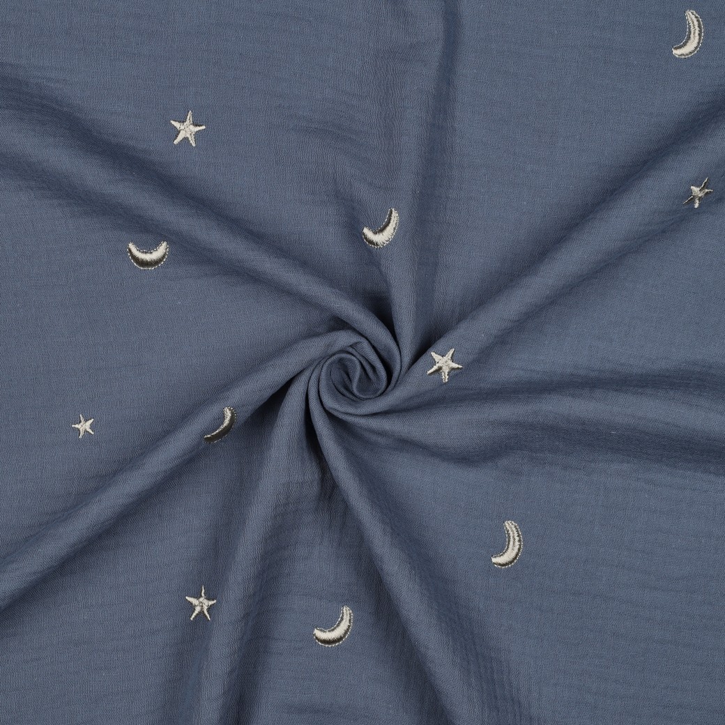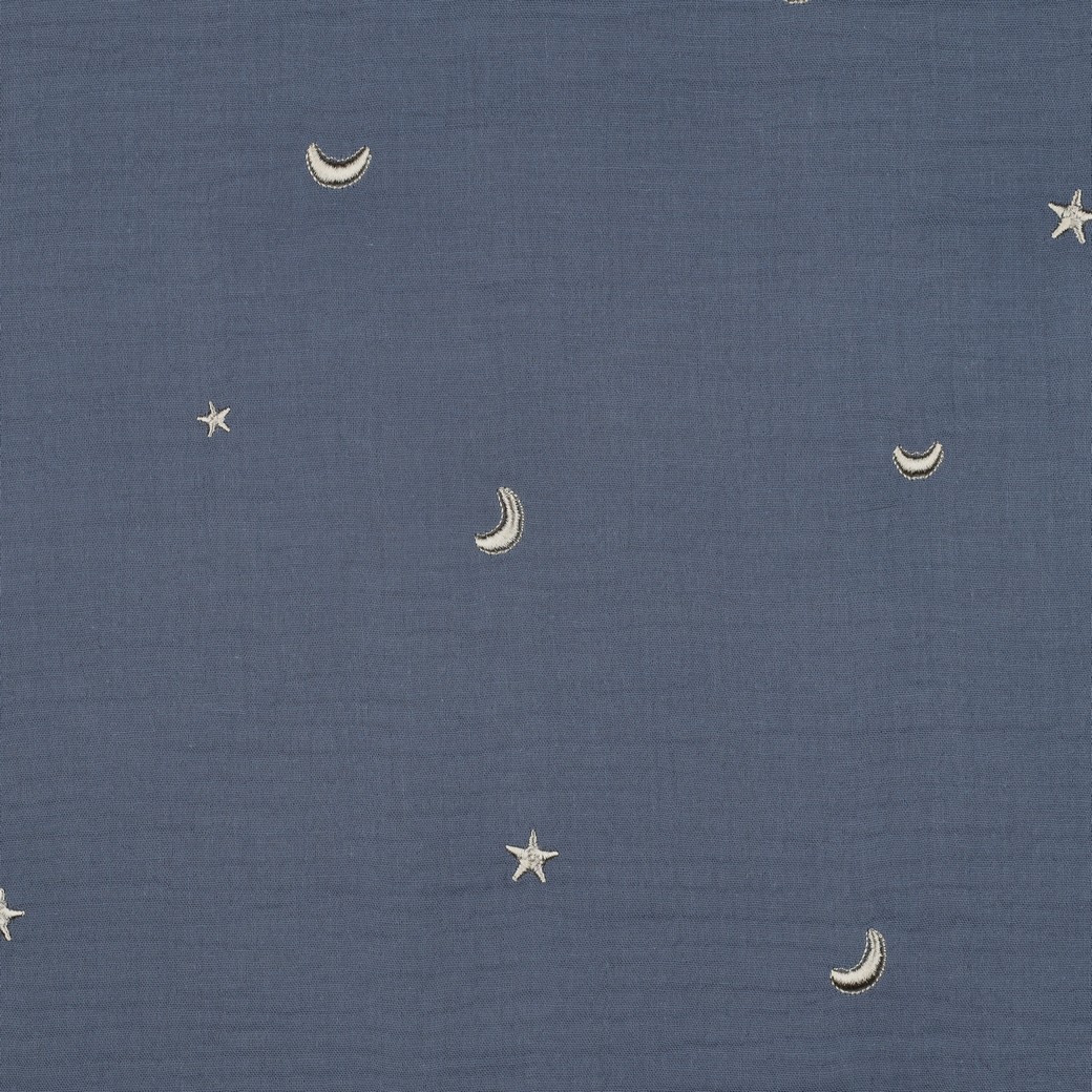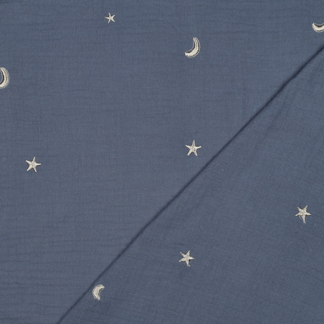 Cette mousseline de coton au fond bleu brume est ornée de petites lunes et étoiles brodées qui évoquent un ciel calme et apaisant. Le contraste délicat entre le bleu doux et la broderie claire donne au tissu un charme discret et intemporel.