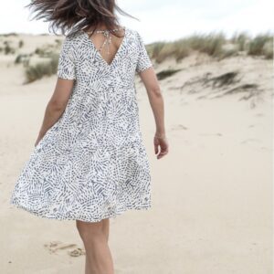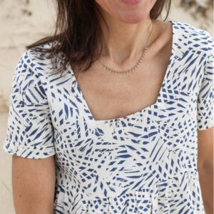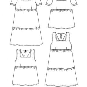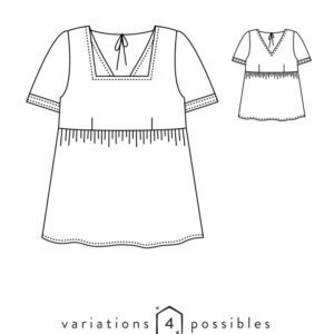 Blouse ou robe à l’encolure trapèze sur le devant et V sur le dos, finie par un biais plaqué. Pour éviter qu’elles ne tombent, les épaules sont délicatement retenues par un lien à nouer. Son style aérien lui est conféré par la ou les basques froncées. Modèle à réaliser avec ou sans manche.
