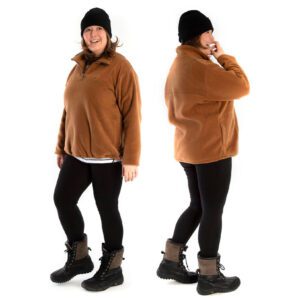 Patron pour pull ample avec demi-zip au devant, col montant et poches latérales.