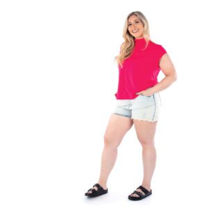 A: Haut court à col montant, sans manches, avec épaule tombante et bande à l’emmanchure. Une coupe moderne qui se combine avec votre pantalon ou jupe préférée.