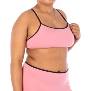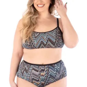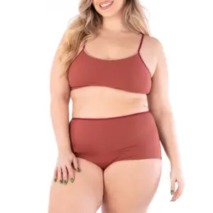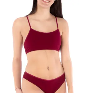 Soutien-gorge à soutien léger avec choix de quatre culottes avec différentes couvrances et hauteurs de taille. Les modèles B, C et D on un élastique replié (foldover) à la taille et sont ourlés à l’ouverture de la cuisse. Le modèle E est fini avec de l’élastique replié (foldover) à la taille et à l’ouverture des cuisses.
