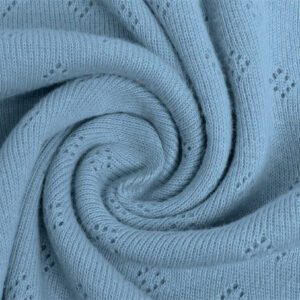 La pointelle est est un tissu mailles, donc un tissu tricoté comme le jersey, le french terry… Comme tous les tissus tricotés elle possède une certaine élasticité, en plus elle est légère, aérée et respirante de par sa composition 100% coton. La particularité de la pointelle est d’avoir dans le tricot des mailles ajourées formant un motif répétitif. C’est donc un tissu agréable à porter en été. Parfaite pour les robes, chandails, camisoles, vestes, vêtements de bébé et plus encore…
