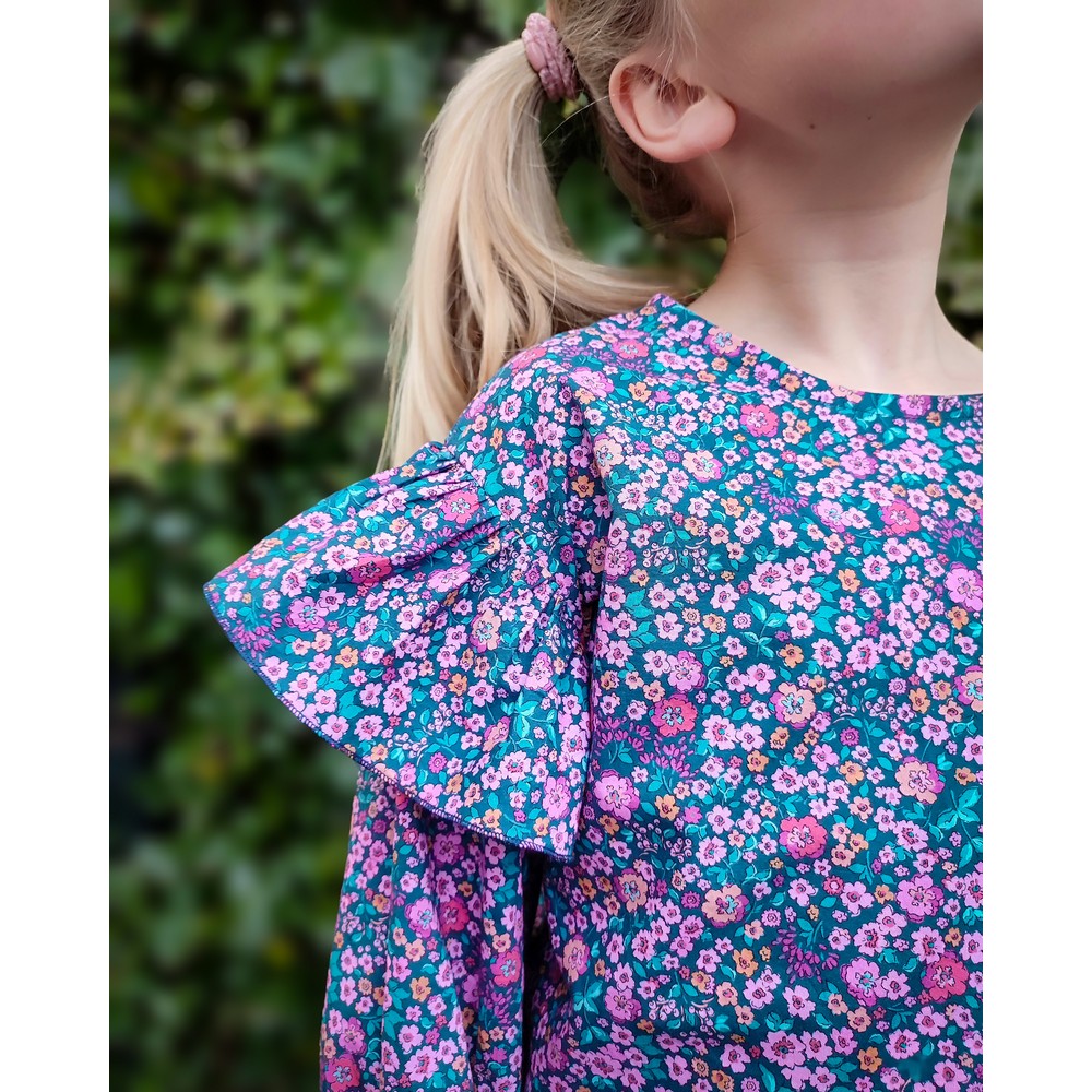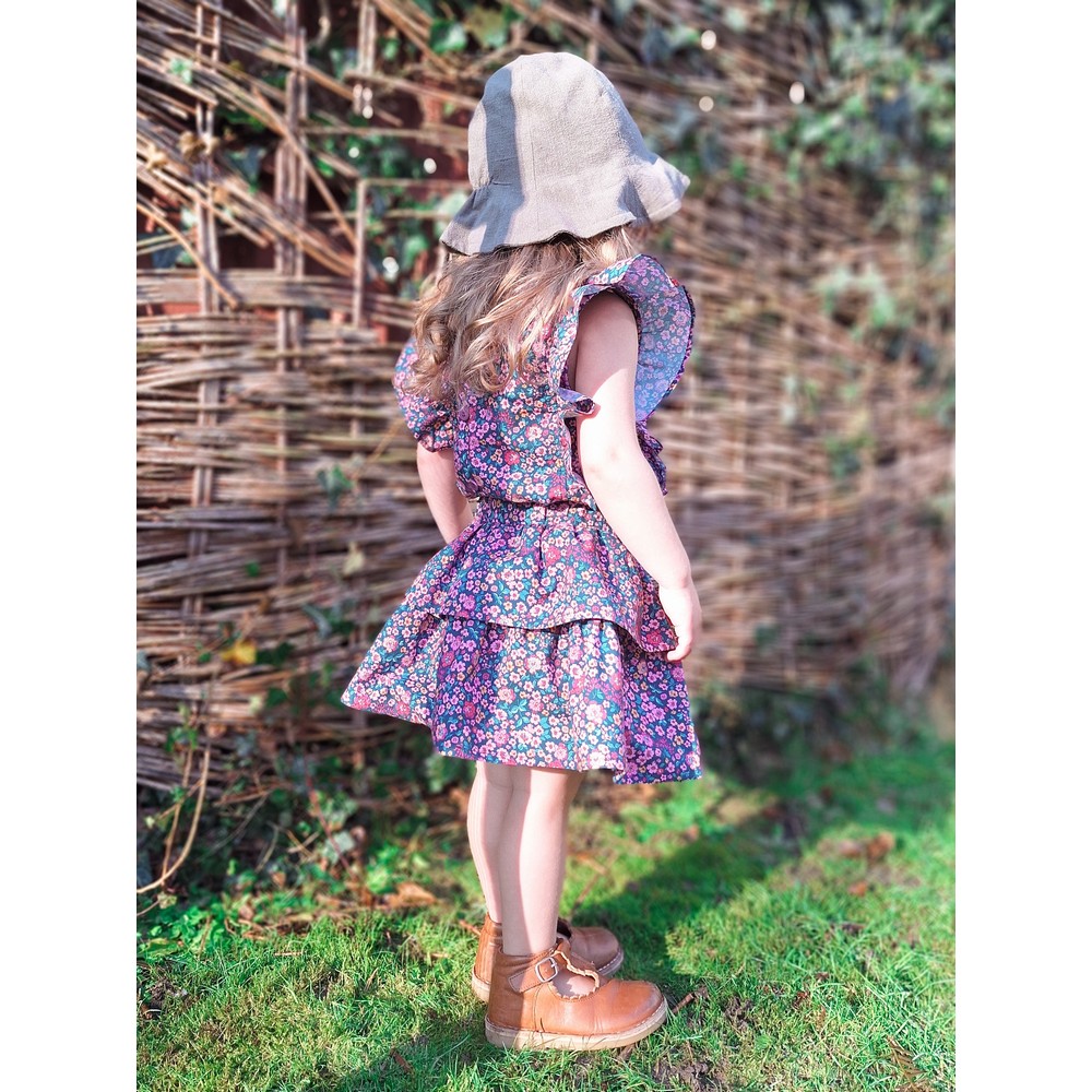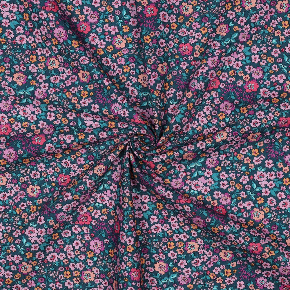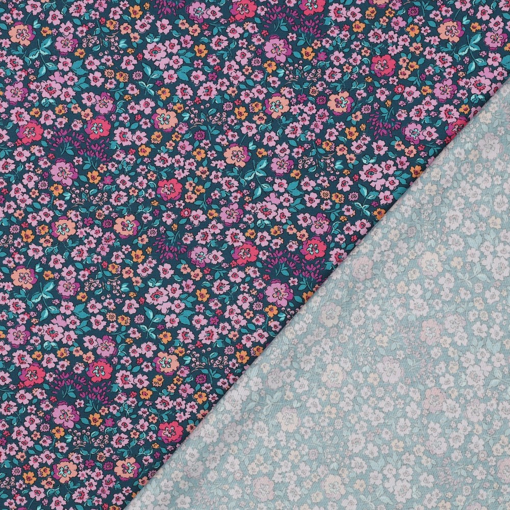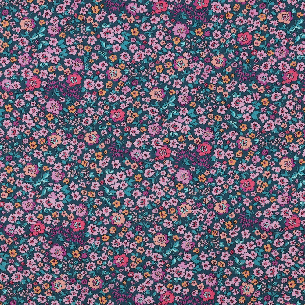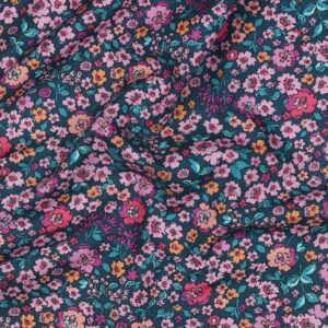 Délicate et poétique, cette popeline de coton est ornée d’une multitude de petites fleurs aux teintes rosées, lilas et moutarde, harmonieusement disposées sur un fond vert profond. Son motif fin et dense évoque une prairie fleurie pleine de douceur, à la fois intemporelle et chaleureuse.