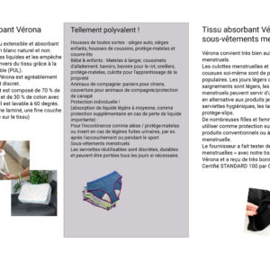 Vérona est un tissu extensible et absorbant que est proposé en blanc naturel et noir. Ce tissu absorbe les liquides et les empêche de s’infiltrer sur l’envers du tissu grâce à la couche imperméable (PUL). En même temps, Vérona est agréablement doux et totalement discret. Ce tissu absorbant est composé de 70 % de viscose (bambou) et de 30 % de coton avec une couche PUL. Il est lavable à 60 degrés.