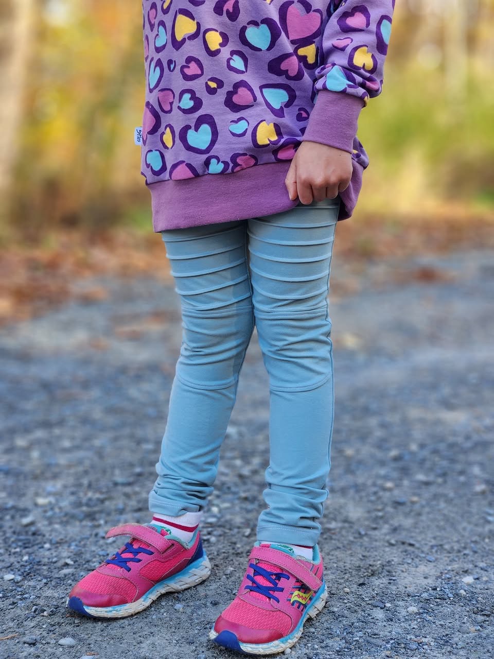 Le look d’un denim (jeans) avec le confort d’un jersey!  Vous connaissez le Jegging? Un mélange entre le jeans et le legging, ce tissu est parfait pour la confection de pantalon, short, jupe qui s’apparentent au jeans mais qui ont l’extensibilité et le confort d’un pantalon extensible.  N’hésitez pas à utiliser du fil de jeans et des surpiqures pour leur donner le look jeans.